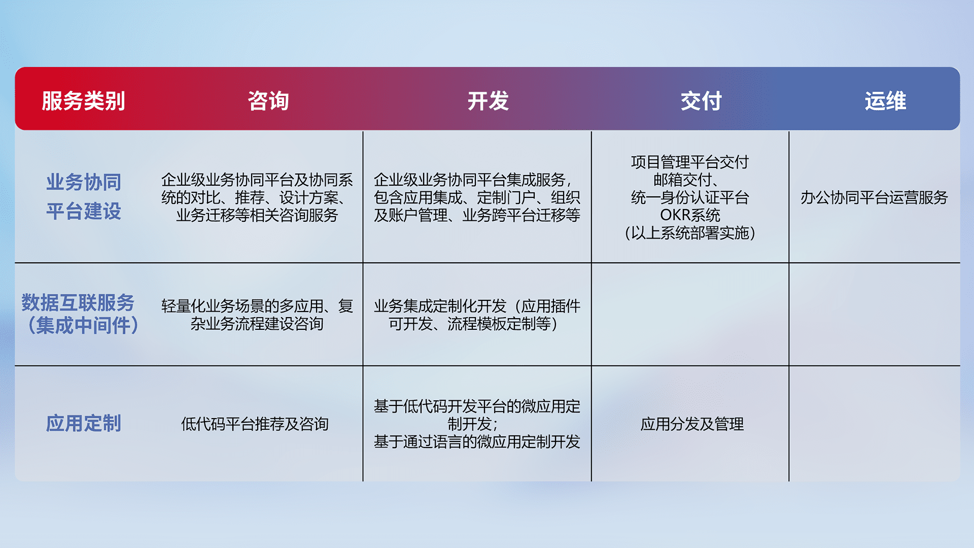针对钉钉、、、企微、、IDaas等平台级产品提供产品的规划、、、方案、、、、交付、、定制化开发等服务,,,实现如统一协同办公、、、智能客户服务、、混合会议管理、、、智能数据查询、、、、等业务场景,,,,实现数字化转型。。。。