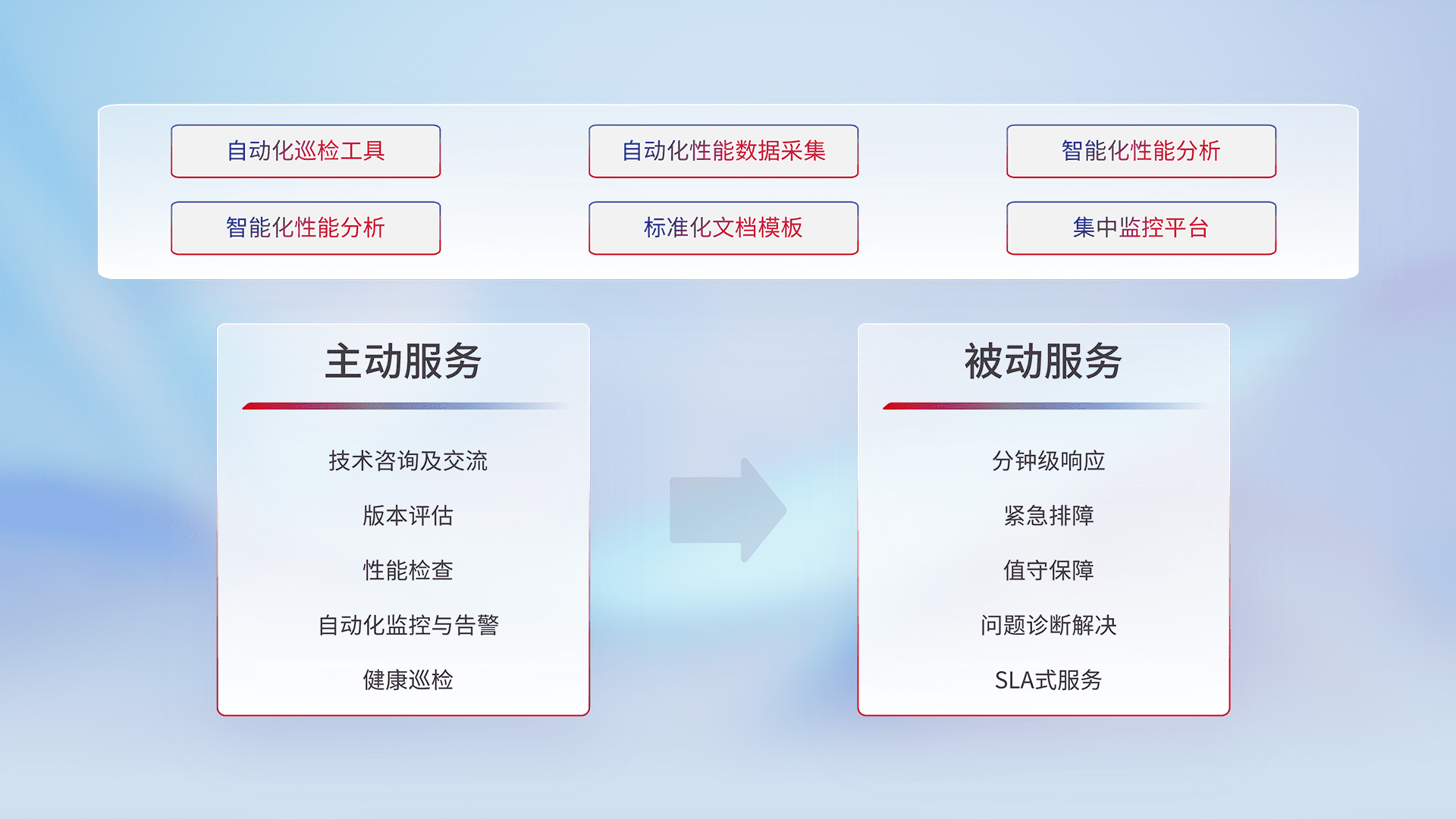 智能化工具和标准化文档,,,,保障服务质量,,,,提供主动服务(包含技术咨询、、版本评估、、、、性能检查、、自动化监控与告警、、、健康巡检)和被动服务包含(分钟级响应、、紧急排障、、、、值守保障、、、问题诊断解决、、SLA服务)。。