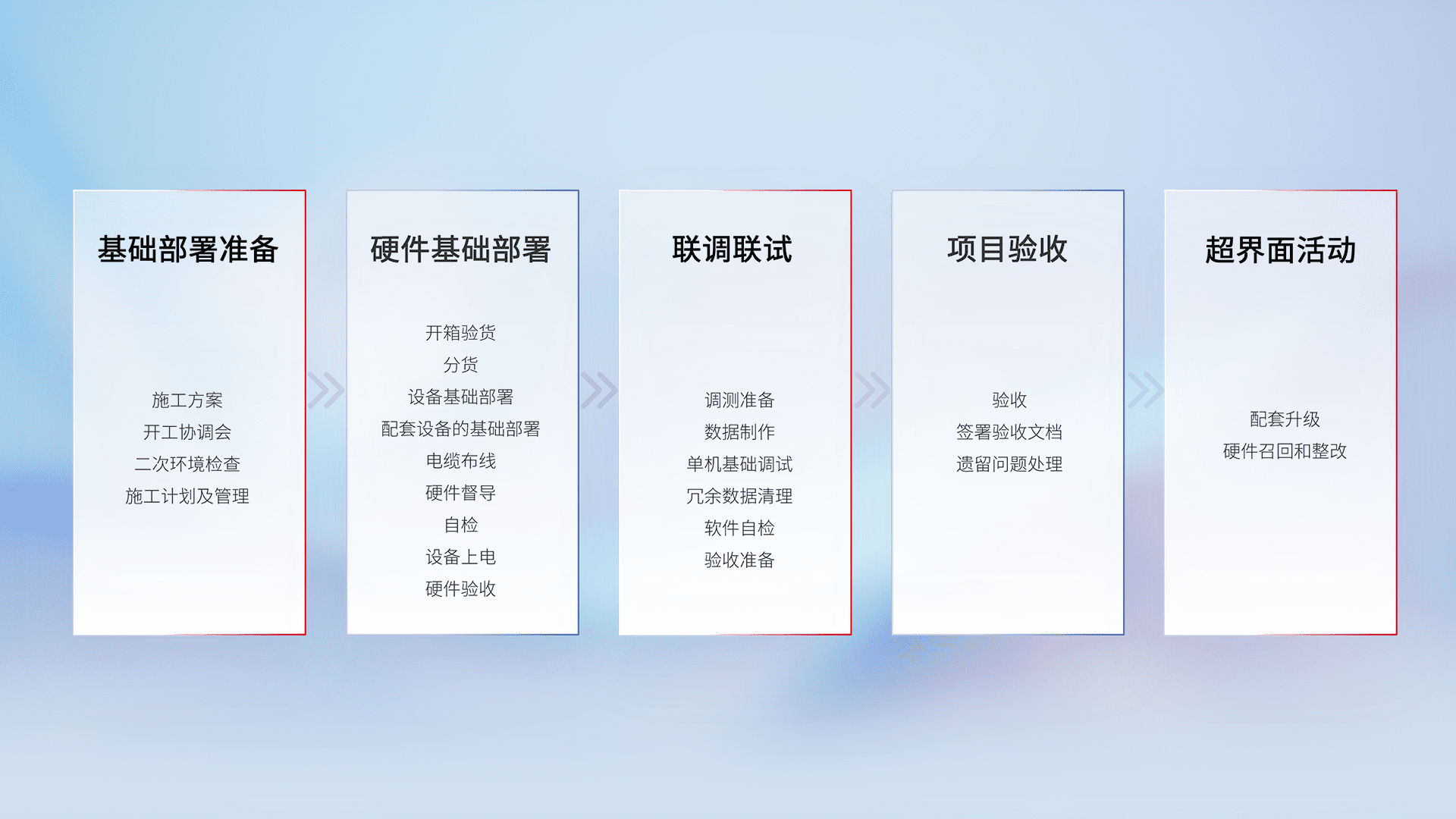 从基础部署准备、、硬件基础部署、、、联调联试、、项目验收、、越界面活动的全过程可追溯,,,,保证施工质量和进度。。。